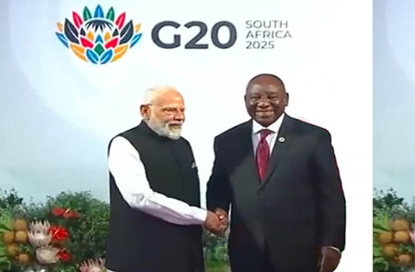 प्रधानमंत्री नरेंद्र मोदी जोहान्सबर्ग में चल रहे G20 शिखर सम्मेलन में शामिल हुए। इस दौरान उन्होंने दक्षिण अफ्रीका के राष्ट्रपति के साथ संवाद किया, जिसमें दोनों नेता हंसते हुए दिखाई दिए। सम्मेलन से पहले, अमेरिका के राष्ट्रपति ट्रंप और रूस के राष्ट्रपति पुतिन ने इसमें भाग लेने से मना कर दिया है। इसके बावजूद, शिखर सम्मेलन अपने निर्धारित एजेंडे के अनुसार आगे बढ़ रहा है।